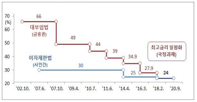 법정 최고금리는 대부업법 및 이자제한법에서 규율하고 있으며 지속적으로 인하를 거쳐 2018년부터 24%를 적용 중입니다. 최근 초 저금리 시대와 서민부담을 덜기 위한 차원에서 20%로 인하 하는 것을 논의하였습니다.