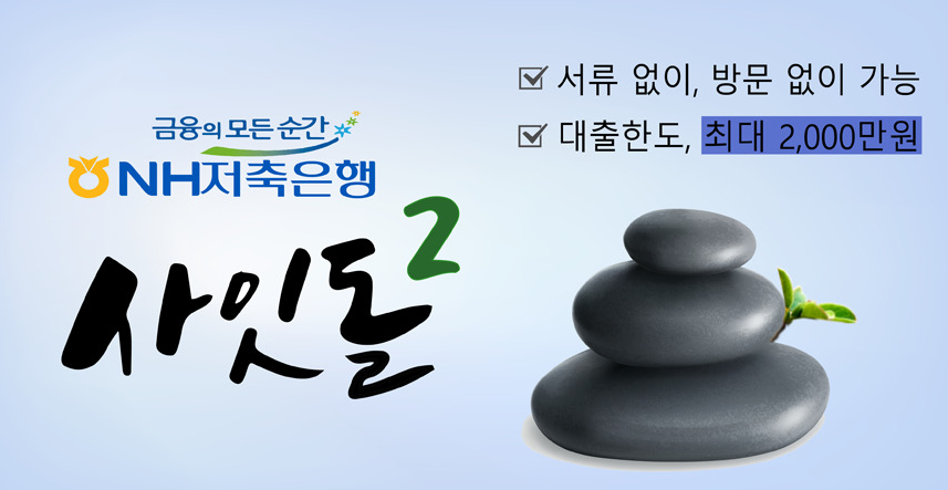대출 한도는 2,000만원 금리는 사잇돌1은 6~10% 금리이며, 사잇돌2는 15~20% 금리를 가지고 있습니다.