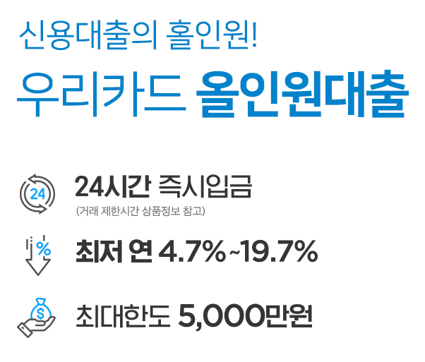 언제 어디서나 쉽게 빠르게 우리카드 소지자가 아니더라도 이용할 수 있는 중금리 상품인 우리카드 올인원 대출에 대해서 알아보도록 하겠습니다.