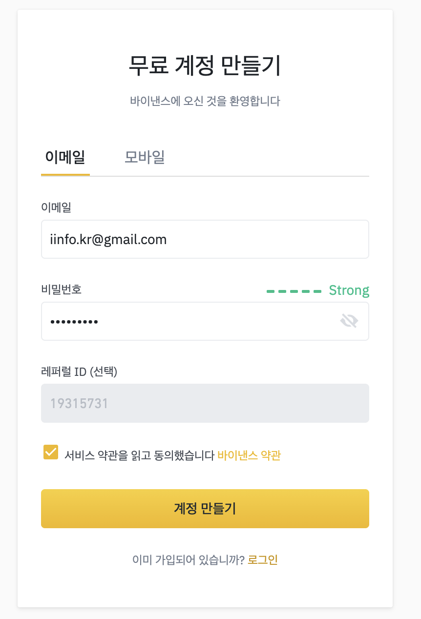 바이낸스 가입방법은 이메일과 모바일 번호를 이용해 가입할 수 있습니다. 선호하는 형태로 가입하시면 되겠습니다. 아마 각자 선호 하는 방식이 있을 겁니다.