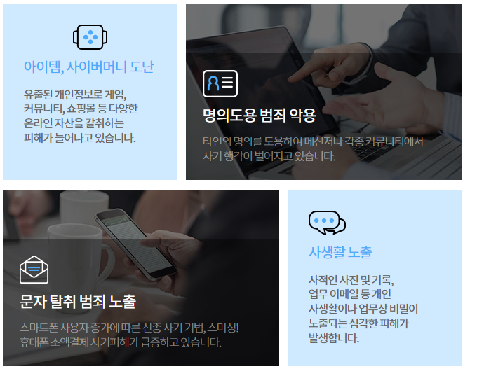 그래서 본인도 모르는 사이에 내 명의로 신용카드를 발급받거나, 대출이 이뤄지고 온라인 게임이나 내 계좌에서 이체가 일어나서 자산을 갈취당하는 등 날이 갈수록 방법은 다양해지고 있는 상태입니다.