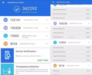 자, 우리는 벤치마킹의 결과를 알고 있지만 그래도 한번 봅시다. 먼저 최근 화재가 되었던 스냅드래곤 8150의 안투투 벤치마크 점수입니다. 놀라운 점수 362,292점!
