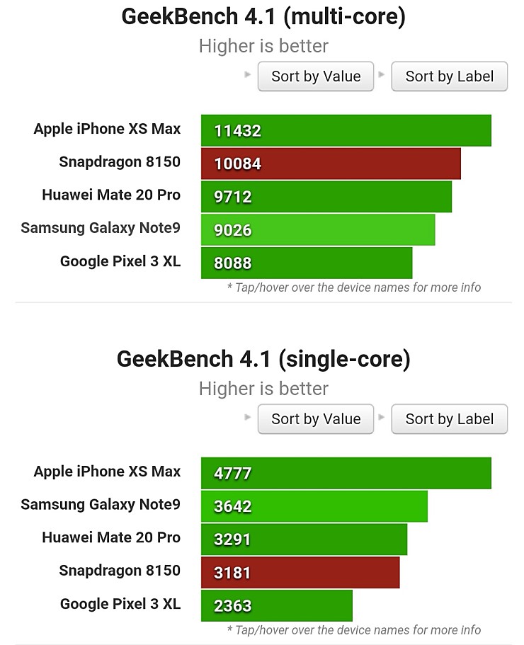 스냅드래곤 8150의 멀티코어, 싱클코어 점수
