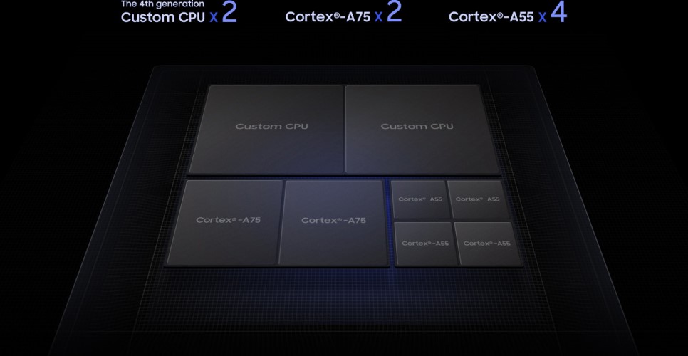 기존 엑시노스는 빅4, 리틀 4의 구조로 설계되어있었습니다. 빅+리틀은 게임과 같은 무거운 작업은 빅코어에서 서핑이나 음악감상과 같은 가벼운 작업은 리틀코어를 사용하는 방식입니다. 반면 엑시노스 9820은 custom cpu 2개와 CorTex-A75 2개, CorTex-A55 4개인 옥타코어로 구성되어있습니다.