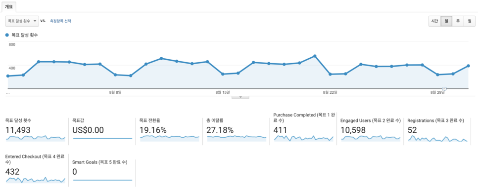 이렇게 설정을 하게 되면 전환 보고서에 목표를 도달한 데이터들이 집계가 되어 표시 됩니다. 아~ 참 당연한 말이군요. 전 시간에도 잠깐 봤지만 목표 달성 횟수와 목표값, 전환율, 이탈율 등에 대한 정보를 확인할 수 있군요.