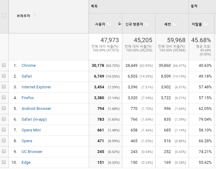 여기서 사용자가 접속하는 브라우저 별로 이탈율을 확인해서 특정 브라우저에서 이탈율이 높은 경우 해당 브라우저 버전에서 오류가 있거나, 프로세스가 복잡하거나 UI/UX 적으로 개선해야할 포인트를 분석해야 할 것 같습니다.