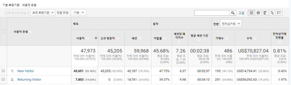 그래서 이 수치를 보면 신규 방문(40%) 보다 재 방문(59%)의 전환율이 훨씬 높을 것을 볼 수 있습니다. 실 데이터는 더 높지 않을까 싶네요.