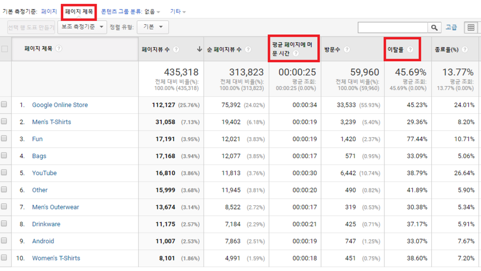 위 경로 '모든 페이지'에서 페이지 제목으로 이탈율과 종료율 같은 데이터를 확인하여 해당 페이지에 문제가 있는지 검토해볼 수 있는 객관적인 자료가 되거나 좋은 지표가 되는 페이지는 다른 페이지 개선에 참고하여 활용하기도 합니다.