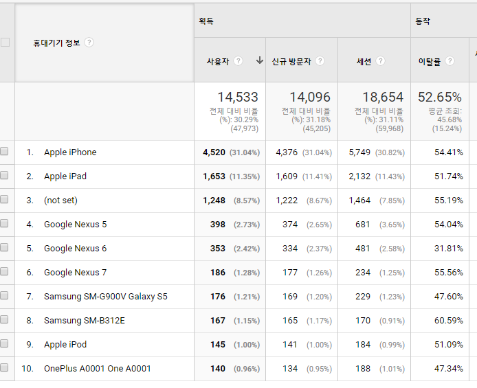 앞서서 브라우저 별로 체크했다면 여기서는 기기 별로 체크할 수 있으니 특정 기기 버전에서 이탈율이 높은 경우 앱 오류가 있는지 점검해볼 수 있고 각 기기의 OS나 해상도 들을 감안한 사이트를 개발하도록 참고할 수 있습니다.