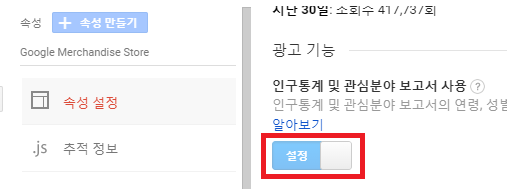 관리 ▶ 속성 ▶ 속성 설정 ▶ 광고 기능 ▶ '인구 통계 및 관심분야 보고서 사용' 을 '설정'으로 변경!!