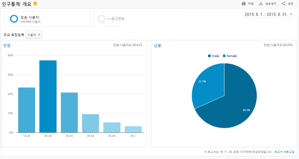 인구통계에서는 방문 사용자의 연령과 성별에 대해서 알 수 있습니다.