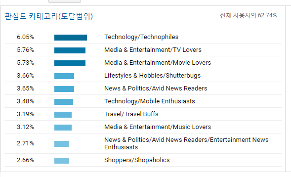 밑의 관심분야를 봅시다. 여기서는 방문자의 웹컨텐츠에 대한 선호도를 알 수 있습니다. 어떤 분야나 카테고리에 관심이 많은지 알수 있어 마케팅에 활용 할 수 있습니다. 예를 들면 테크나, 쇼핑, 여행 등등...