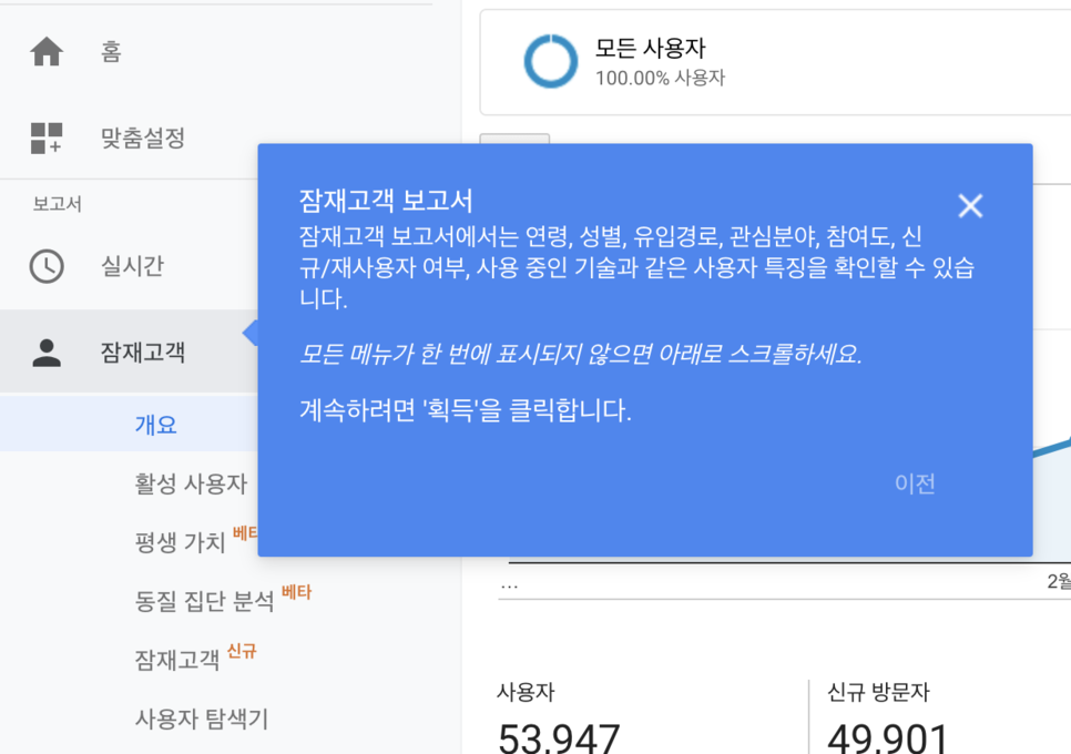잠재고객 보고서에서는 연령, 성별, 유입경로, 관심분야, 참여도, 신규/재사용자 여부, 사용 중인 기술과 같은 사용자 특징을 확인할 수 있습니다.