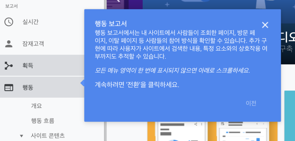 행동 보고서에서는 내 사이트에서 사람들이 조회한 페이지, 방문 페이지, 이탈 페이지 등 사람들의 참여 방식을 확인 할 수 있습니다. 추가 구현에 따라 사용자가 사이트에서 검색한 내용, 특정 요소와의 상호 작용 여부까지도 추적할 수 있습니다.