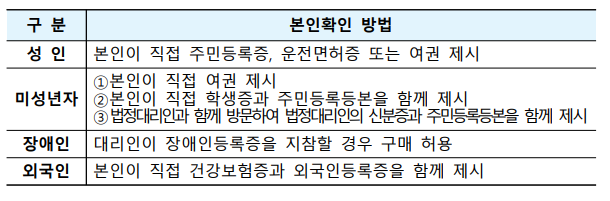 ㅇ 본인이 직접 약국을 방문하여 주민등록증 등 공인신분증을 제시하고 구매하는 것이 원칙