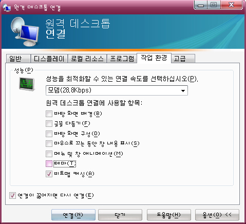 마지막으로는, 원격 데스크톱 옵션을 의심해봤다. 원격 데스크톱 연결에는 각종 보안 옵션 및 화면 표시 옵션 등등이 있다. 이것들이 어떤 충돌을 일으켜 그런 것은 아닌지 의심을 해 본 것이다. - 그런데 계정 옵션도, 화면 해상도도 기타 고급 기능도 모두 관련이 없었다.