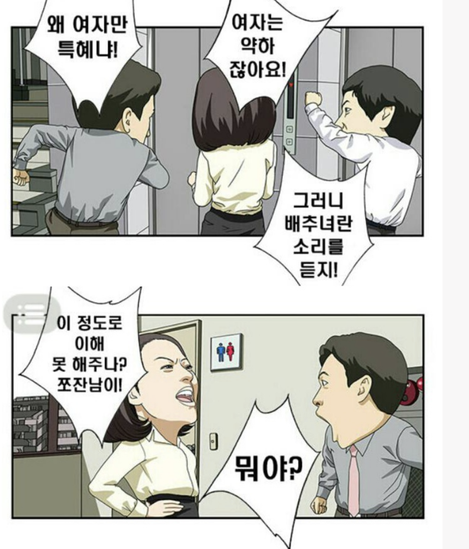 정부는 남자와 여자가 편을 갈라 남혐, 여혐을 하기를 조장하는 것 같다. "달마야 놀자"라는 웹툰을 보면 사장 및 임원진에 대한 반감을 줄이기 위해 일부러 여자에게 해택을 주고 남,녀가 대립하여 싸우도록 만들고 있다.