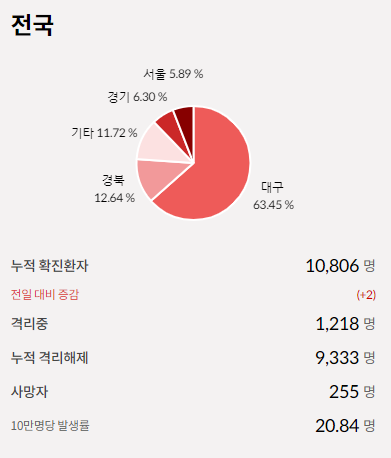 현재(5월 6일) 누적 확진환자 수는 10,806명으로 전일대비 2명이 늘었고, 격리중인 환자는 1,218명, 누적 격리 해제된 환자는 9,333명, 사망자는 255명으로 10만명당 발생률은 20.84명입니다.
