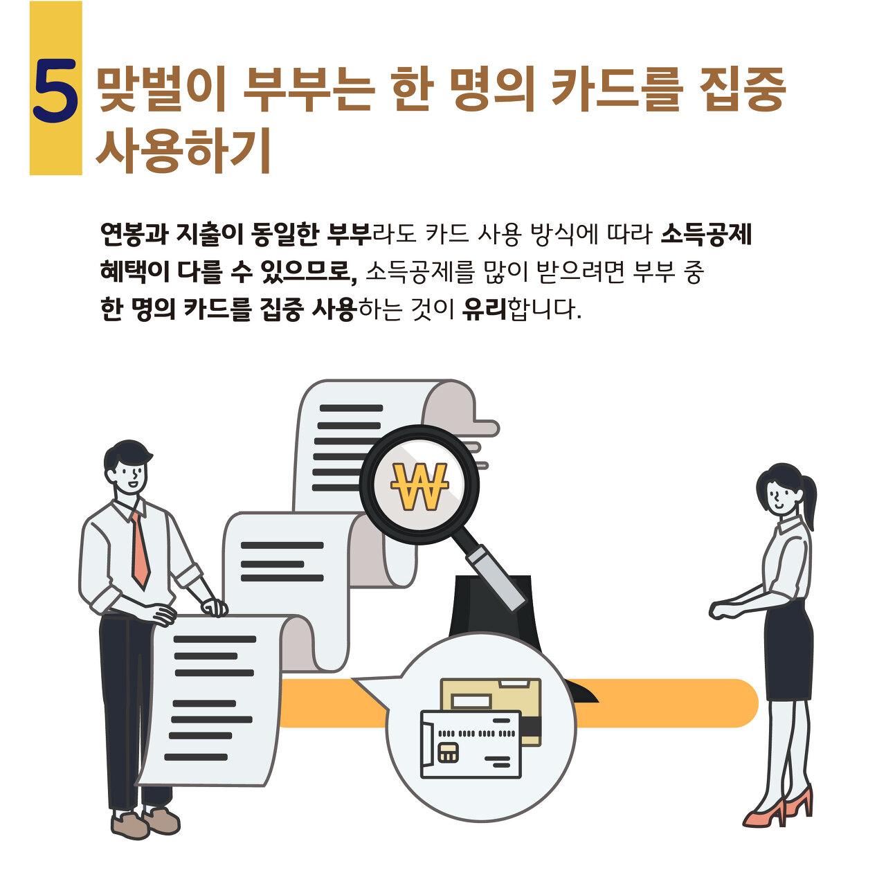 연봉과 지출이 동일한 부부라도 카드 사용 방식에 따라 소득공제 혜택이 다를 수 있으므로, 소득공제를 많이 받으려면 부부 중 한명의 카드를 집중 사용 하는 것이 유리합니다.