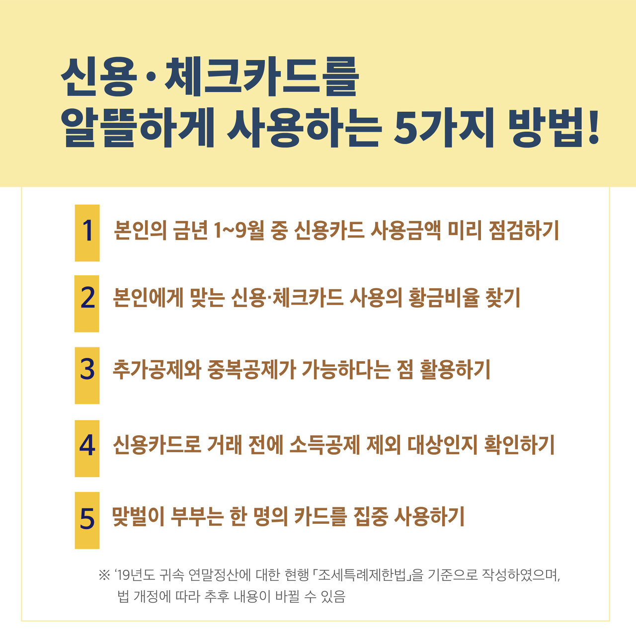 이에 따라 소비자는 1~9월 중 사용한 신용카드 등 사용금액 (이하 '신용카드 사용금액')을 국세청의 "연말정산 미리보기"(www.hometax.go.kr) 서비스를 통해 확인하고, 나머지 기간 동안 신용카드를 효과적으로 사용하는 방안을 고려할 수 있습니다.