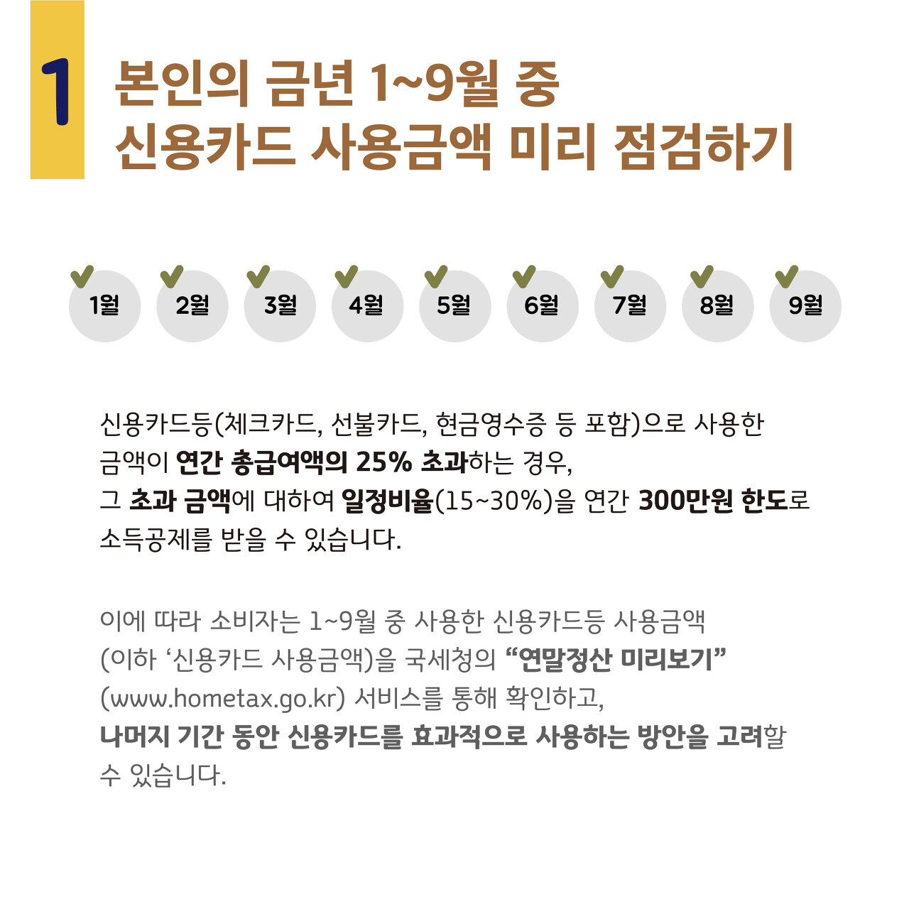 - 1.1 본인의 금년 1~9월 중 신용카드 시용금액 미리 점검하기
