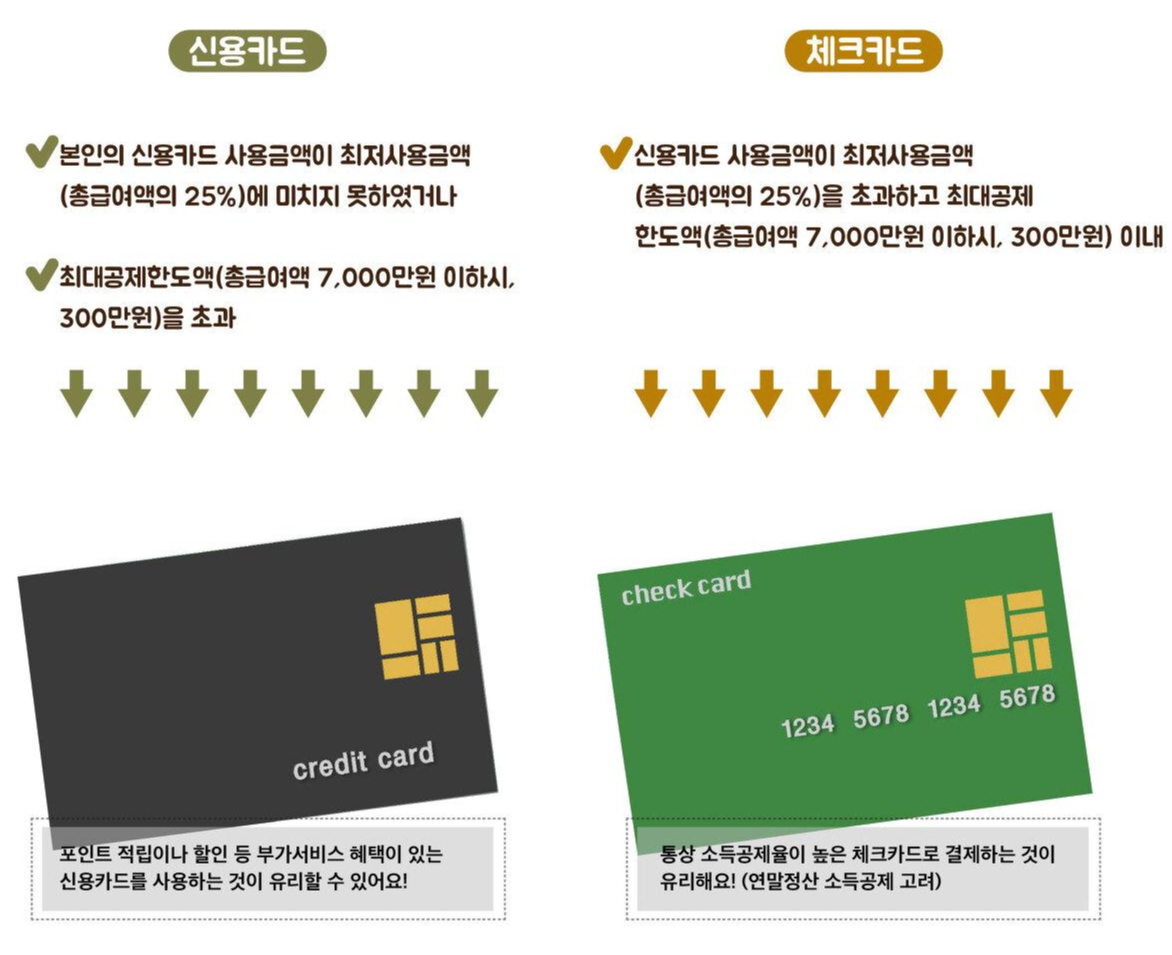 체크카드 : 신용카드 사용금액이 최저사용금액(총급여액 25%)를 초과하고 최대공제한도액(총급여액 7,000만원 이하시, 300만원) 이내인 경우 통상 소득공제율이 높은 체크카드로 결제하는 것이 유리합니다. 연말정산 소득공제를 고려해서요.